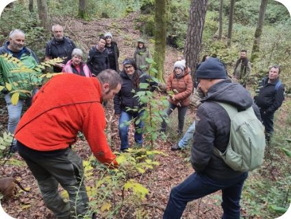 Austausch zur zukunftsfähigen Forstwirtschaft: Bei einer Exkursion im Treemer Wald stellten wir unsere Ansätze zu Ökosystemdienstleistungen und Baumartenwahl vor.